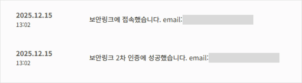 또한 링크 생성 이후에는 활동 로그를 통해 수신자의 접속 여부, 파일 열람·삭제 여부 등 공유 상태를 확인할 수 있습니다. 보안 링크로 공유된 파일은 이메일 입력 및 인증 절차를 거쳐야 열람 및 다운로드가 가능해, 무단 접근 위험도 줄일 수 있습니다.